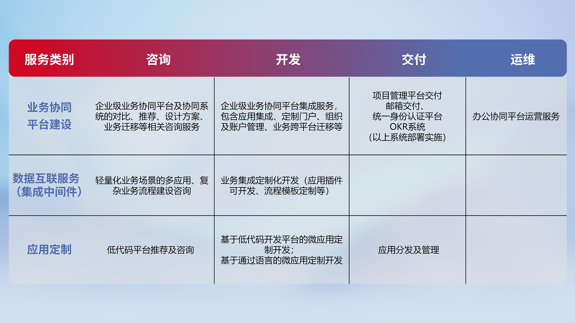 针对钉钉、、企微、、、、IDaas等平台级产品提供产品的规划、、方案、、、、交付、、、定制化开发等服务,,,实现如统一协同办公、、智能客户服务、、混合会议管理、、智能数据查询、、、、等业务场景,,实现数字化转型。。