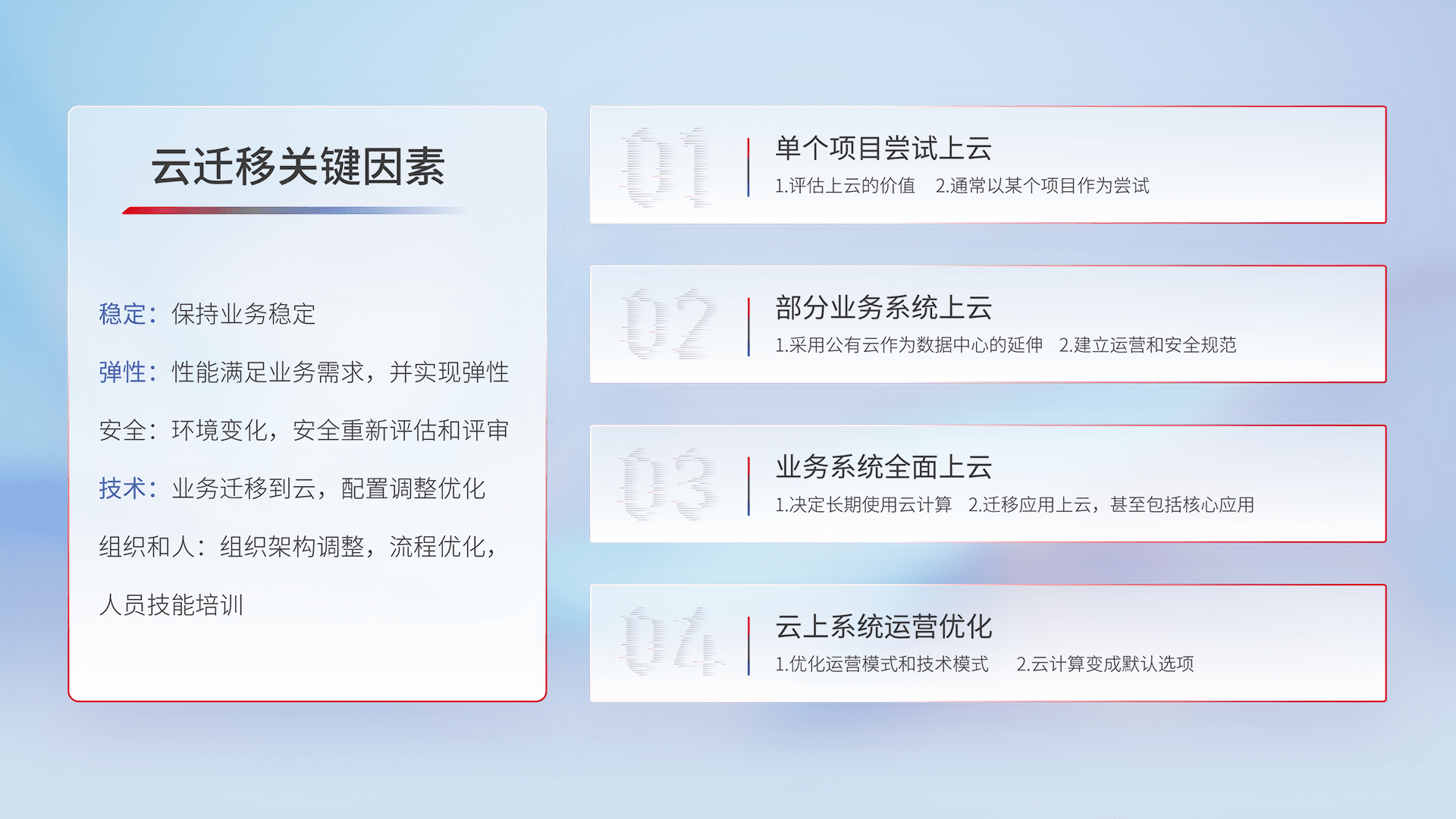 结合实际业务,,,,从规划设计、、、、云平台选型、、、云原生改造、、、、数据迁移、、集成交付,,,,迁移全过程为客户识别最佳上云路径,,,,做好风险识别管理,,设计网络架构、、身份权限、、安全审计合规、、操作审计、、日志审计、、、、监控告警策略、、、多站点容灾设计等,,,,对云上基础设施进行整体规划,,提升IT治理水平,,,,以满足弹性、、、、高可用、、、高性能的需求。。