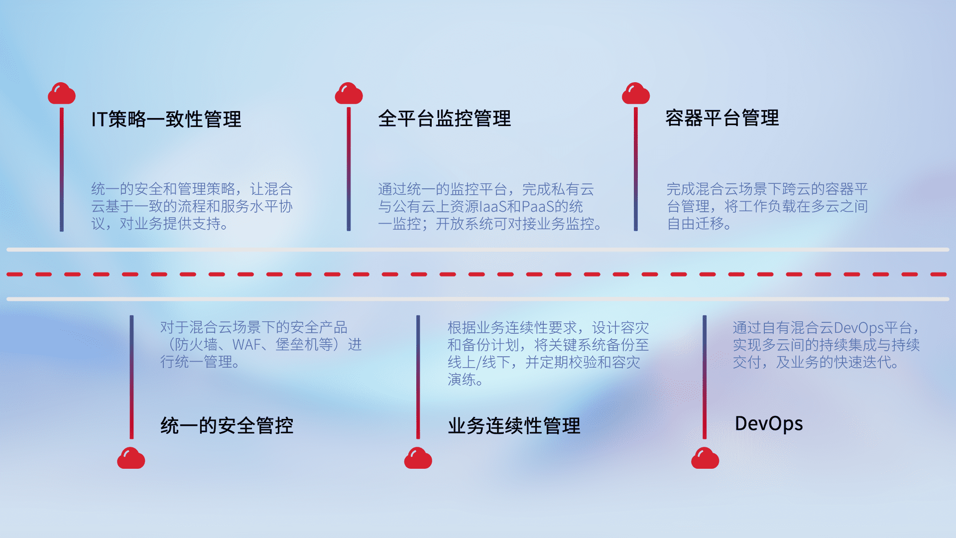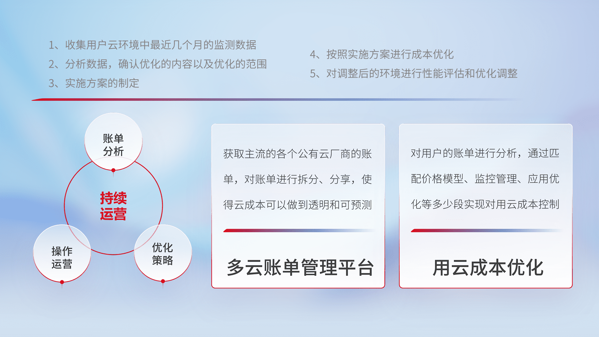 通过多云纳管,,,以统一的资源数据模型把客户的云资源进行抽象和封装,,,,进而实现对多云资源的统一操作,,保障云资源管理的可靠性、、、稳定性与可用性。。量身定制化运维内容,,,配置、、、开发运维、、补丁管理、、、、备份、、、监控、、、认证和访问管理、、审计和日常巡检等,,,保障在用云过程中的可靠度,,稳定度以及高可用率。。。